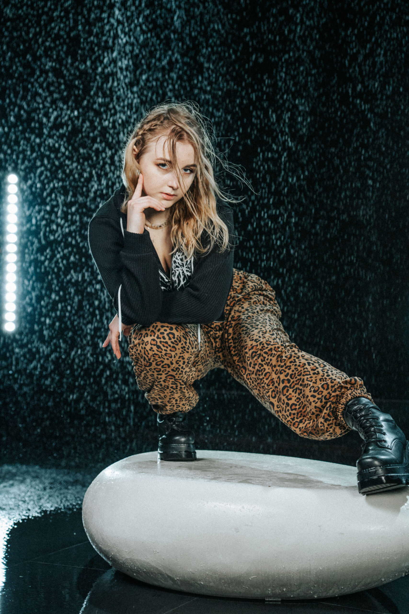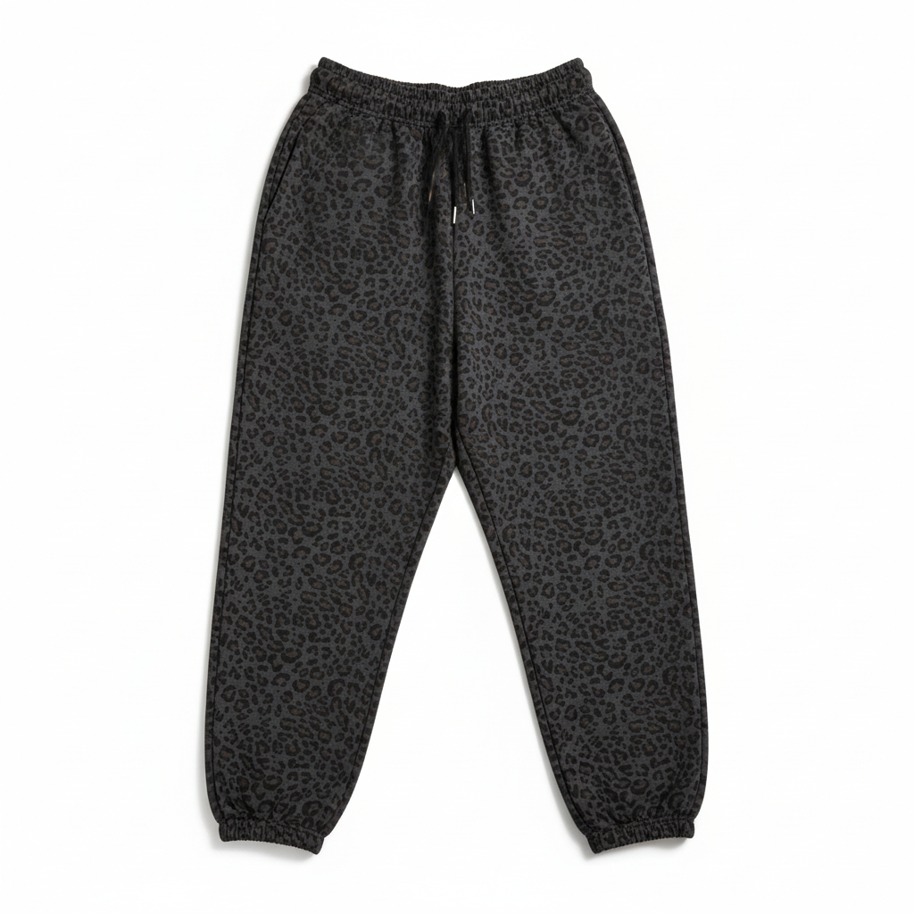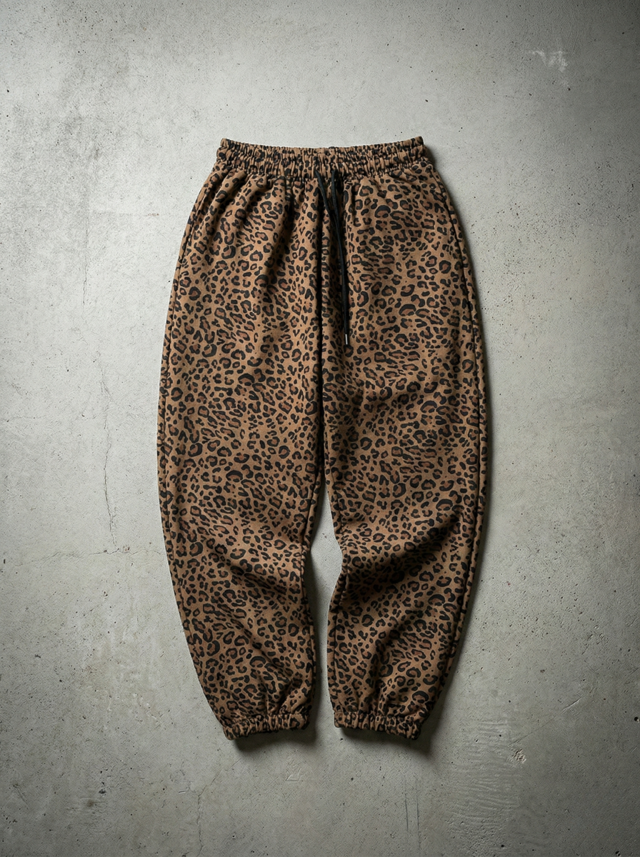 Materiałowe spodnie w panterkę ze ściągaczami w pasie i w kostkach.